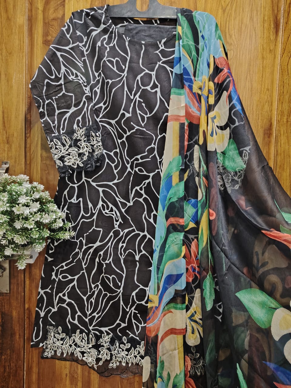 Elevate your ethnic style with this gorgeous Black Embroidery Kurti Pant Dupatta Set. Designed with intricate embroidery on the neckline, sleeves, and hem, this outfit exudes timeless elegance. The soft black fabric offers a luxurious feel, while the beautifully crafted dupatta adds a touch of sophistication. Perfect for festive events, parties, or evening gatherings, this ensemble combines traditional charm with a modern edge.