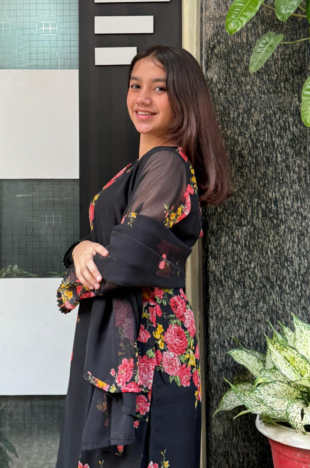 Make a bold yet elegant statement with this black georgette floral Kurti and Farsi Salwar set. The kurti features vibrant pink and yellow floral prints, paired with a beautifully detailed neckline and semi-sheer georgette sleeves for a premium look. The Farsi Salwar adds a stylish wide-flare silhouette, giving the outfit perfect comfort and flow. The matching printed georgette dupatta completes the set with a soft and graceful finish.