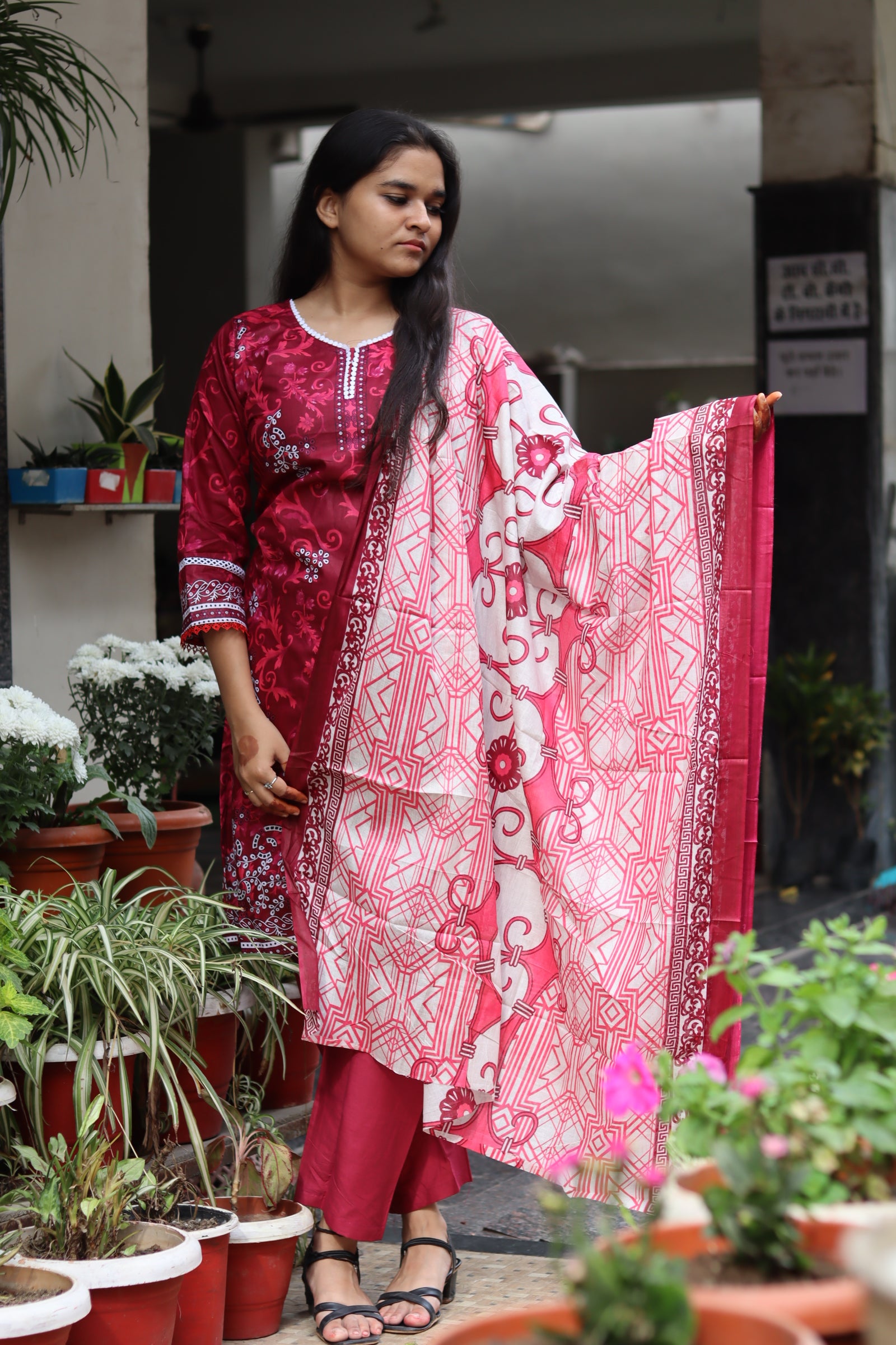 Bring elegance and comfort together with this Maroon digital printed kurti pant set. Made from soft breathable cotton fabric, this outfit features intricate navy blue and mustard floral and geometric patterns that add a touch of sophistication. The 3/4th sleeves with lace detailing and straight-cut design make it perfect for daily wear or casual outings. Pair it with simple accessories and sandals for an effortlessly stylish look.