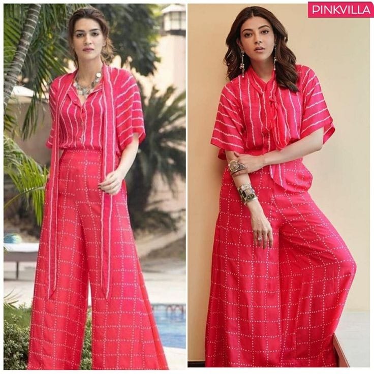 Bottom wide-leg palazzo pants me hai, jisme geometric dotted print diya gaya hai, jo movement ke saath flowy aur classy lagta hai. Matching printed stole/scarf outfit ko complete aur layered look deta hai.