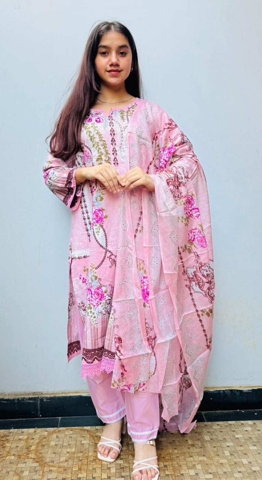 Upgrade your ethnic wardrobe with this Pink Digital Print Kurti Pant Dupatta Set, crafted from soft and breathable cotton blend fabric for all-day comfort.