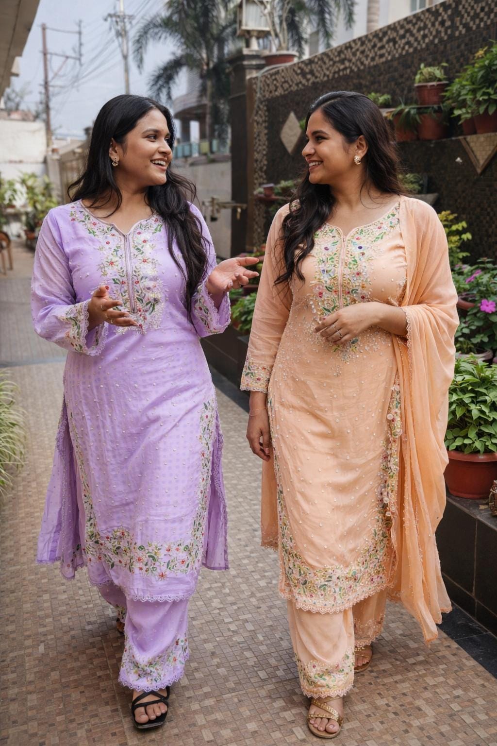 Elevate your ethnic wardrobe with this graceful Twining dress set crafted in flowy georgette fabric. Designed in two soft, elegant shades—Lavender and Peach—this kurti pant dupatta set offers a perfect blend of modern charm and traditional finesse.