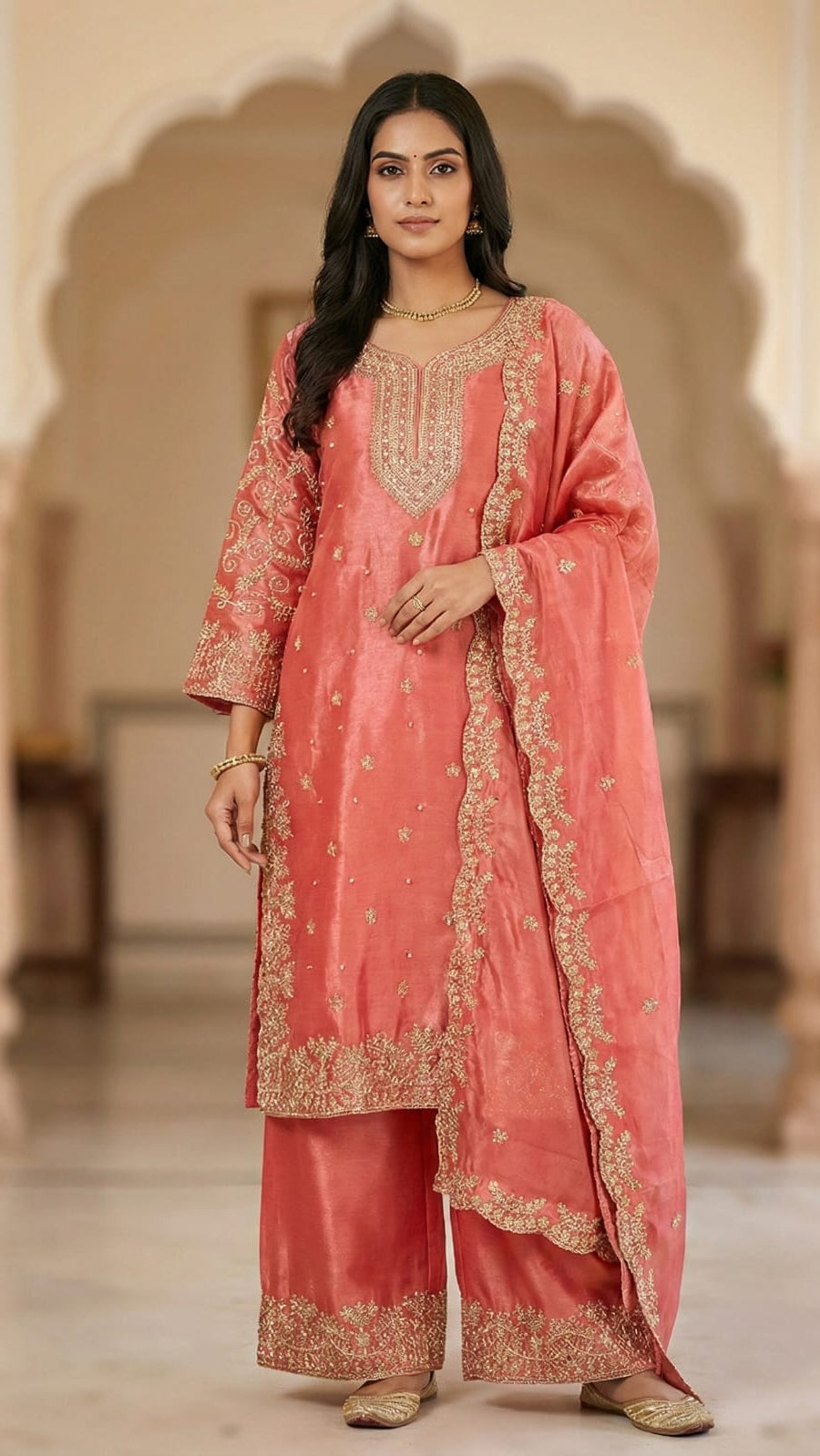 Elevate your festive wardrobe with this stunning white plazo set crafted from premium Jimmy Choo fabric! The kurti features exquisite heavy embroidery work with an intricately designed neckline that radiates royal elegance. The plazo showcases all-over detailed embroidery, creating a rich, sophisticated silhouette perfect for weddings and celebrations. Complete the look with the matching soft organza dupatta adorned with delicate embroidery and a graceful lace border. This is your go-to ensemble for turning heads at any special occasionβbecause sometimes you need to dress like royalty!